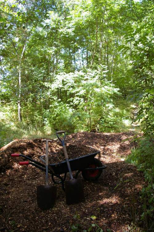 Wheelbarrow, woodchip and shovels