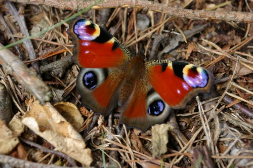Peacock butterfly on ground