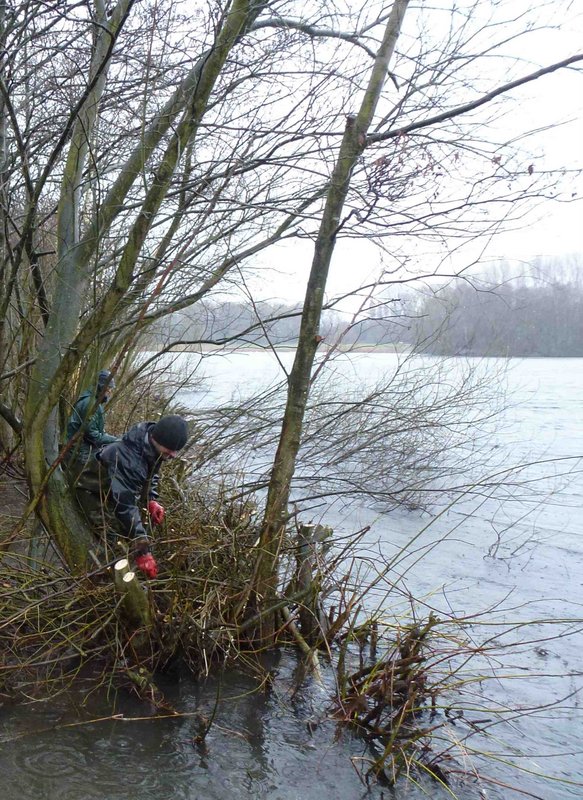 More willow groynes at Chorlton Water Park » Weaving cut willow in to form the new groynes